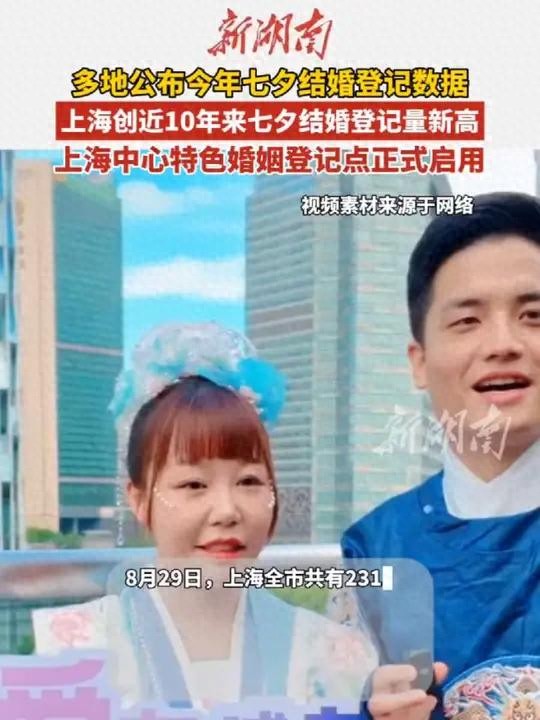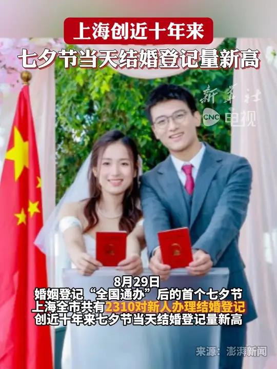 8月29日七夕节,全国民政局集体变身"爱情收费站",上海2310对新人扎堆领证,创下十年新高;新疆赛里木湖登记点凌晨就排起长龙,深圳让机器人当证婚人,新人拍赛博朋克婚纱照,这场全国通办后的首个七夕,直接把结婚登记整成大型"爱情赶集"现场。