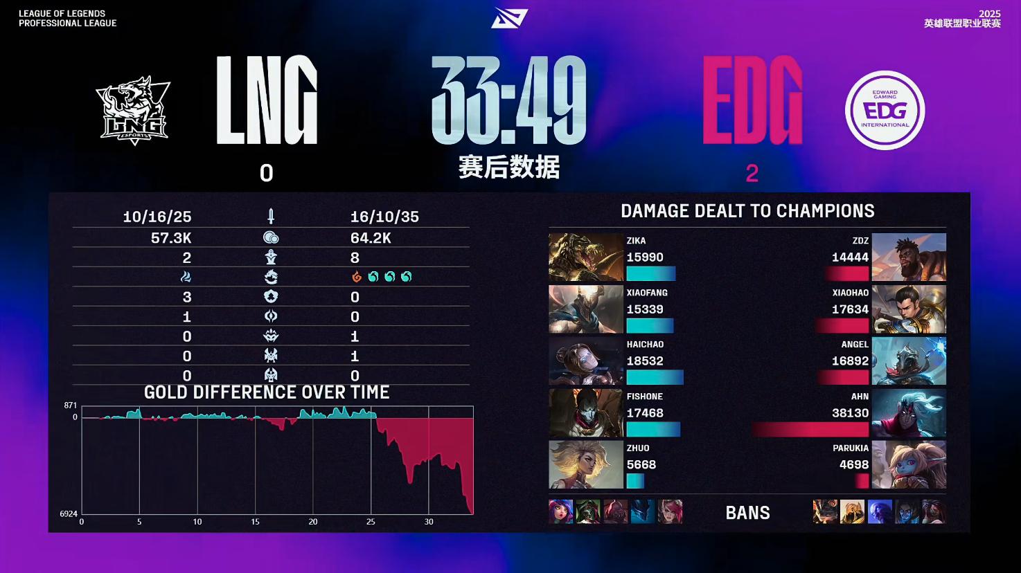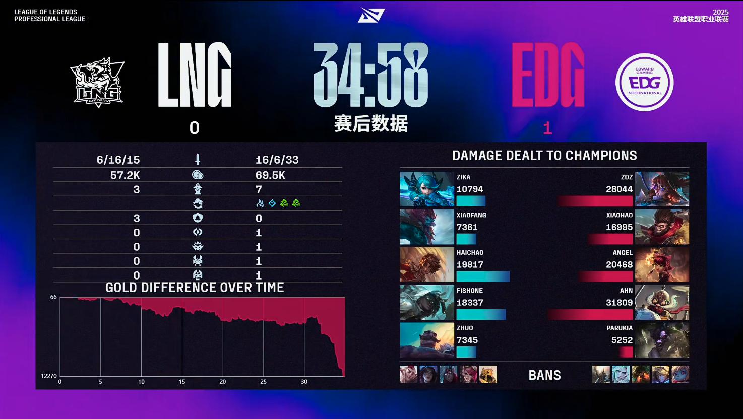 结果比赛,被EDG打成了单方面的碾压局。比赛第7分钟左右,中路爆发小规模团战,EDG拿下一血;比赛第11分钟左右,野区爆发团战,EDG打出1换2;比赛第26分钟左右,爆发小龙团,EDG打出1换2;比赛第31分钟左右,野区爆发团战,EDG打出1换3;最终34分58秒,EDG团灭LNG,先赢一局!