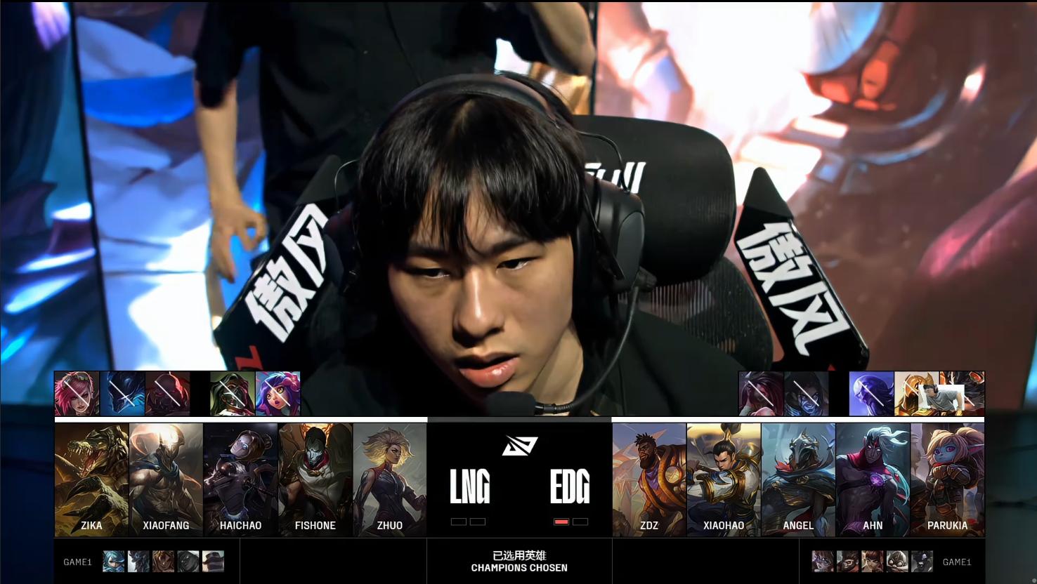 第一局比赛,LNG蓝色方,禁用:沙皇、蔚、韦鲁斯、卡莎、洛,选用:Zika格温、xiaofang巨魔、haichao岩雀、fishone赛娜、Zhuo布隆;EDG红色方,禁用:潘森、破败王、泰坦、EZ、波比,选用:Zdz阿萝拉、Xiaohao猴子、Angel安妮、Ahn飞机、Parukia阿利斯塔